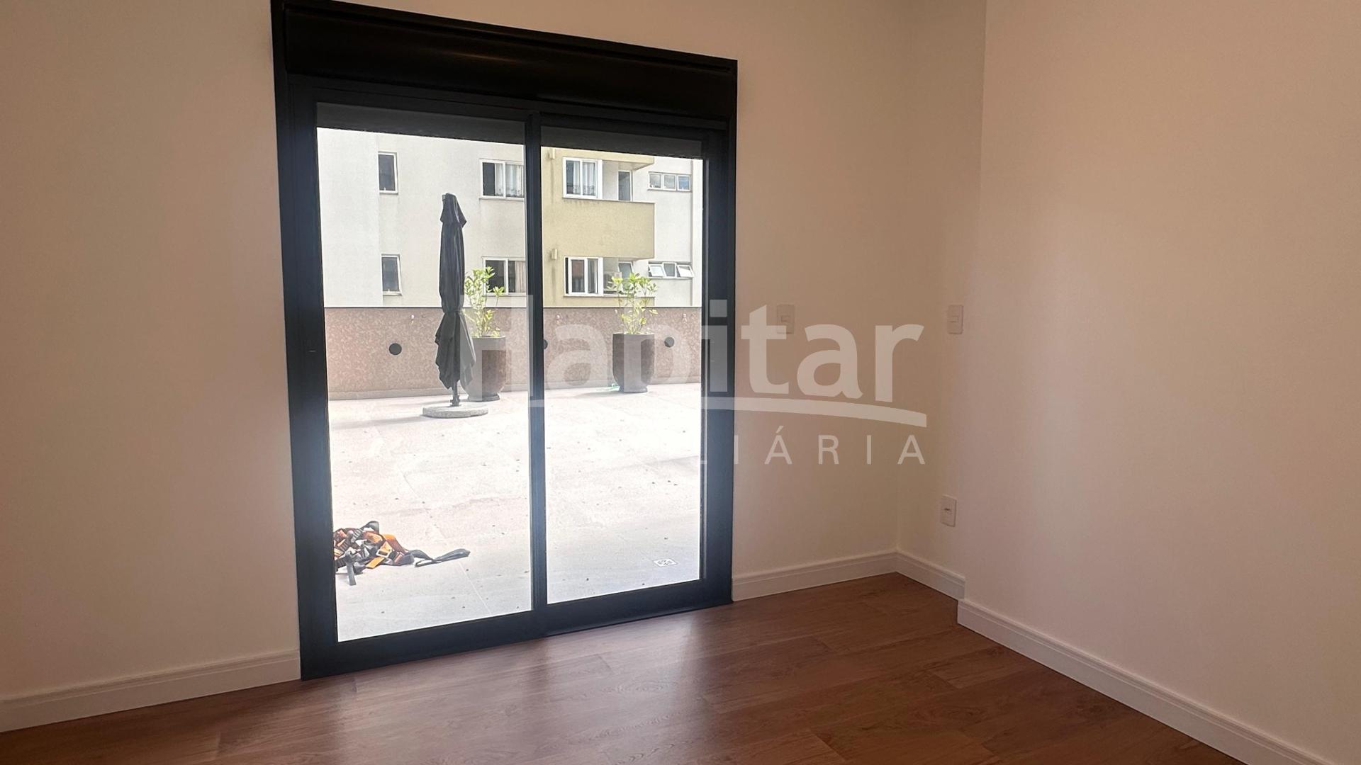 Sim, esse apartamento com uma suíte e mais um quarto, conta com uma varanda externa de 64,00 m², ensolarada e mobiliada.