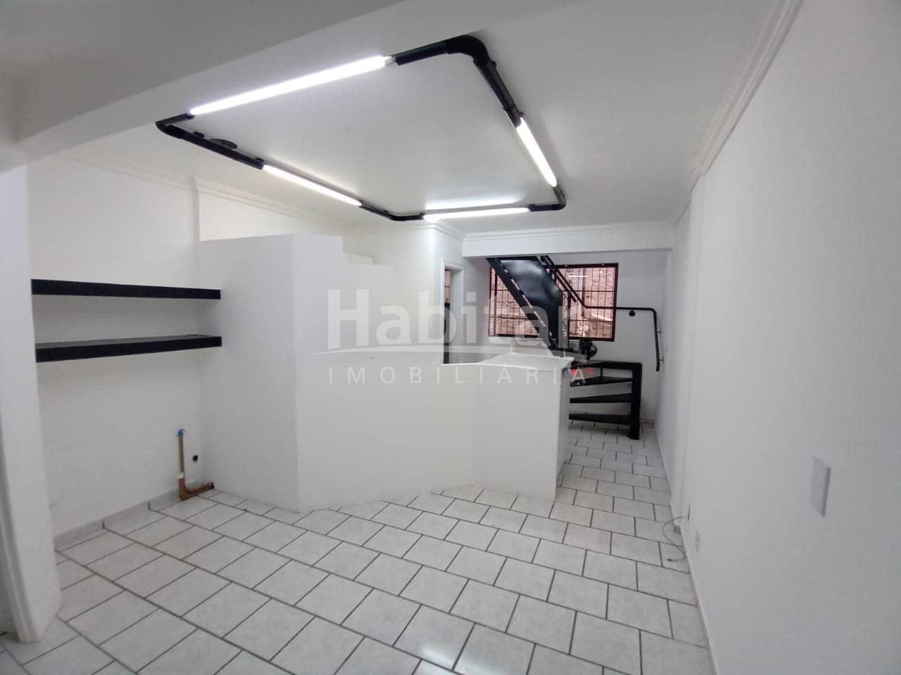 Sala em galeria, semi mobiliada, escada, mezanino com laminado e cortinas nas janelas, Recepção, Wc social, Mezanino com divisória. Área construída : 61,29 m²