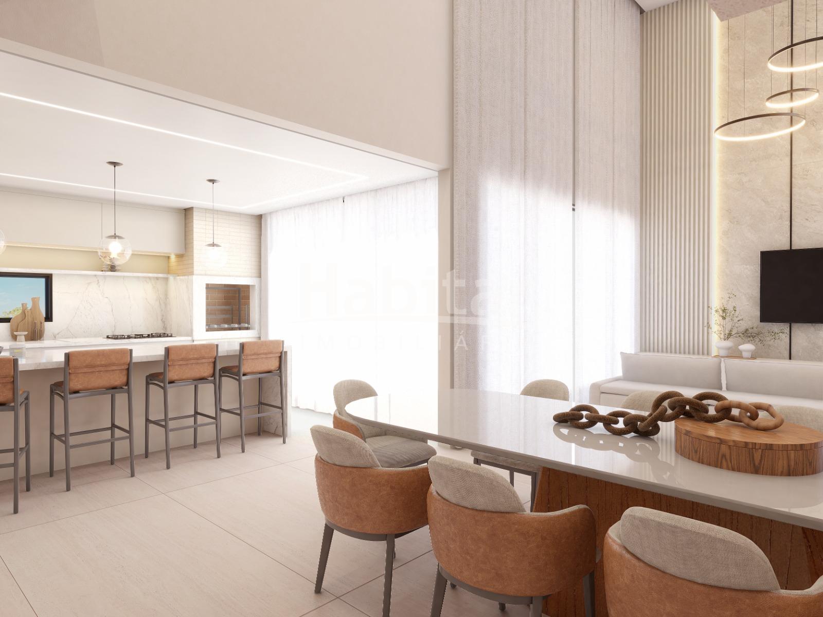 Amplo espaço de sala e cozinha com ilha + churrasqueira