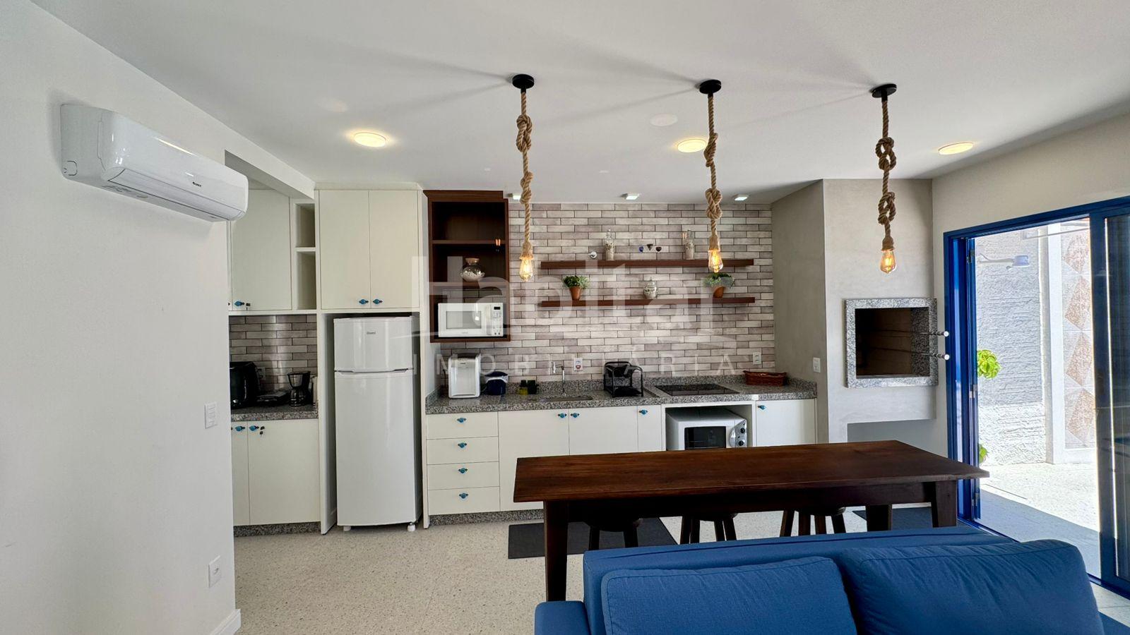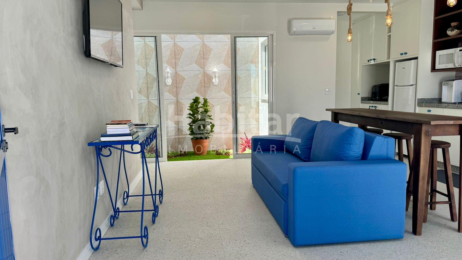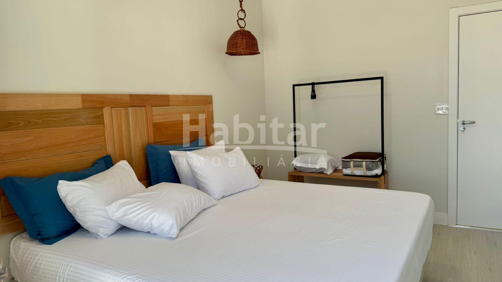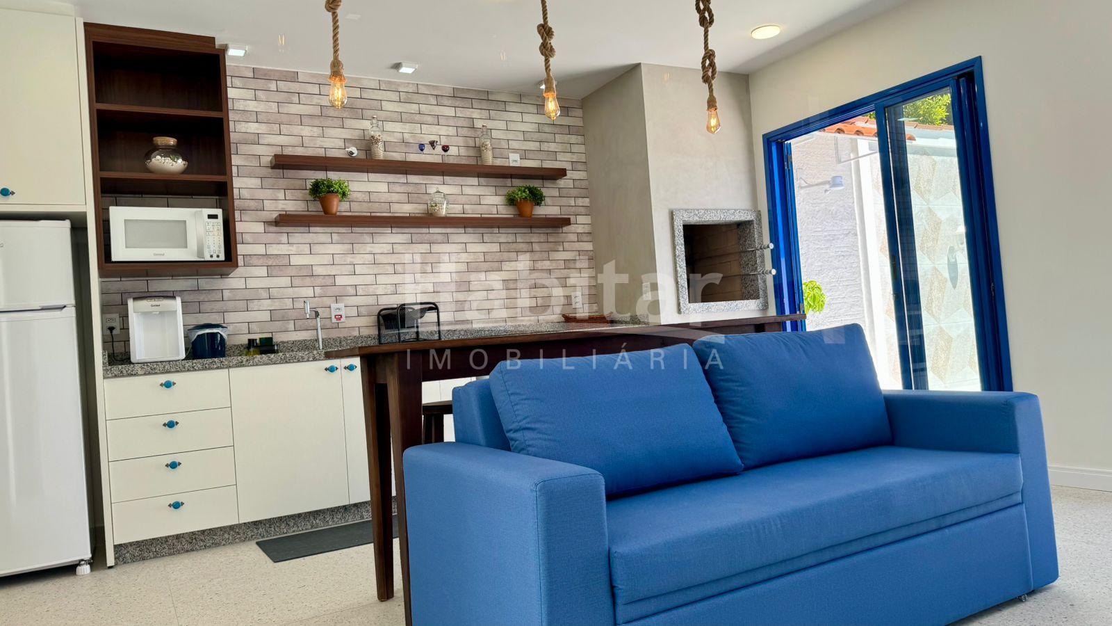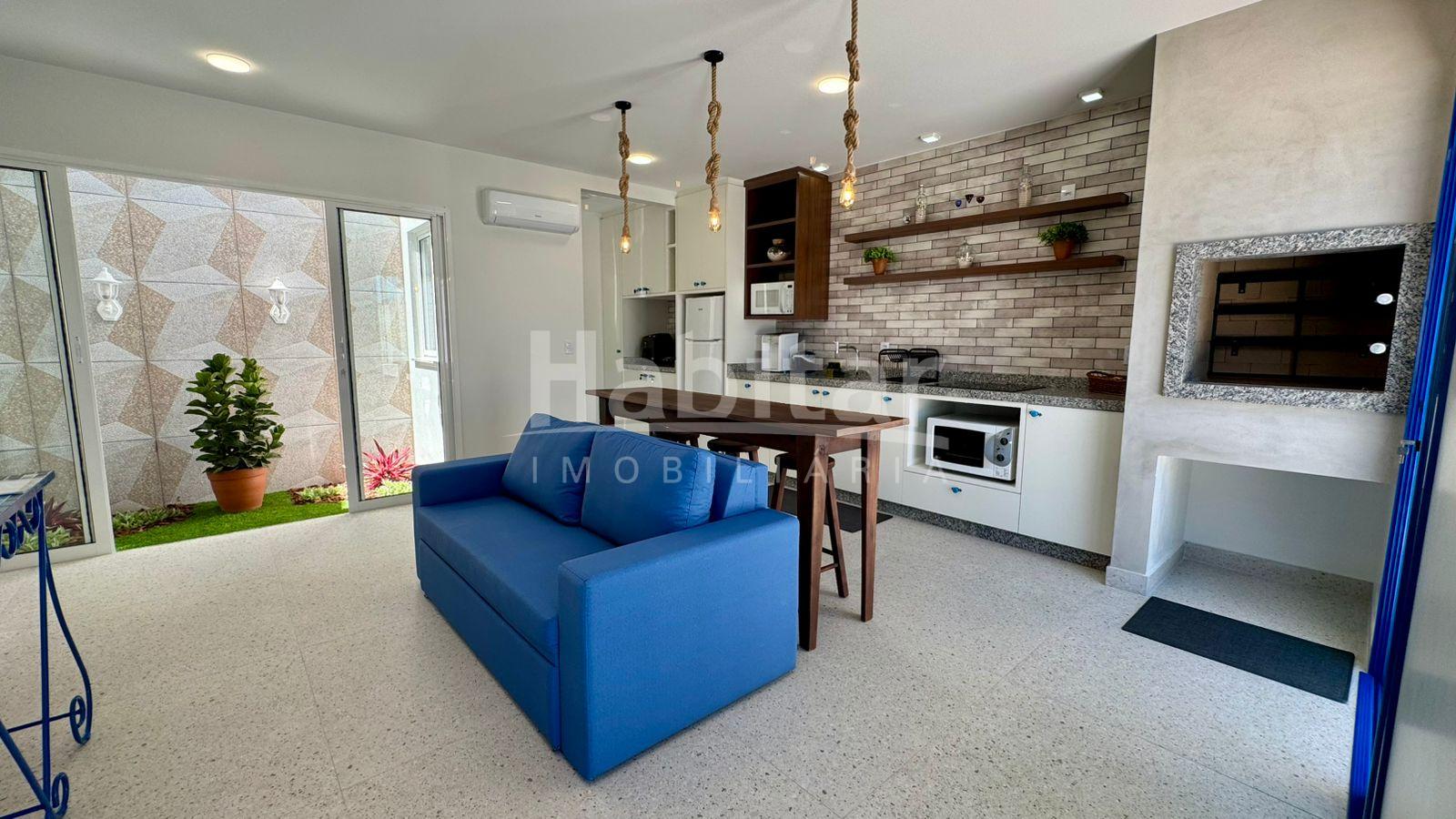 O espaço conta com quarto com cama king size, sofá-cama queen, área externa charmosa e piscina, trazendo a sensação de férias o ano todo.